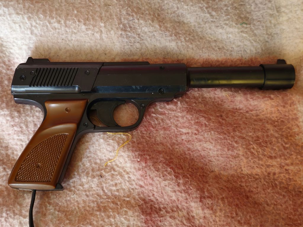 This Pong has the common six game GI AY-3-8500 chip running the show, and offers Tennis, Hockey, Squash, Hand Ball, Shooting 1, and Shooting 2, the last two require the pistol attachment which was included with the console