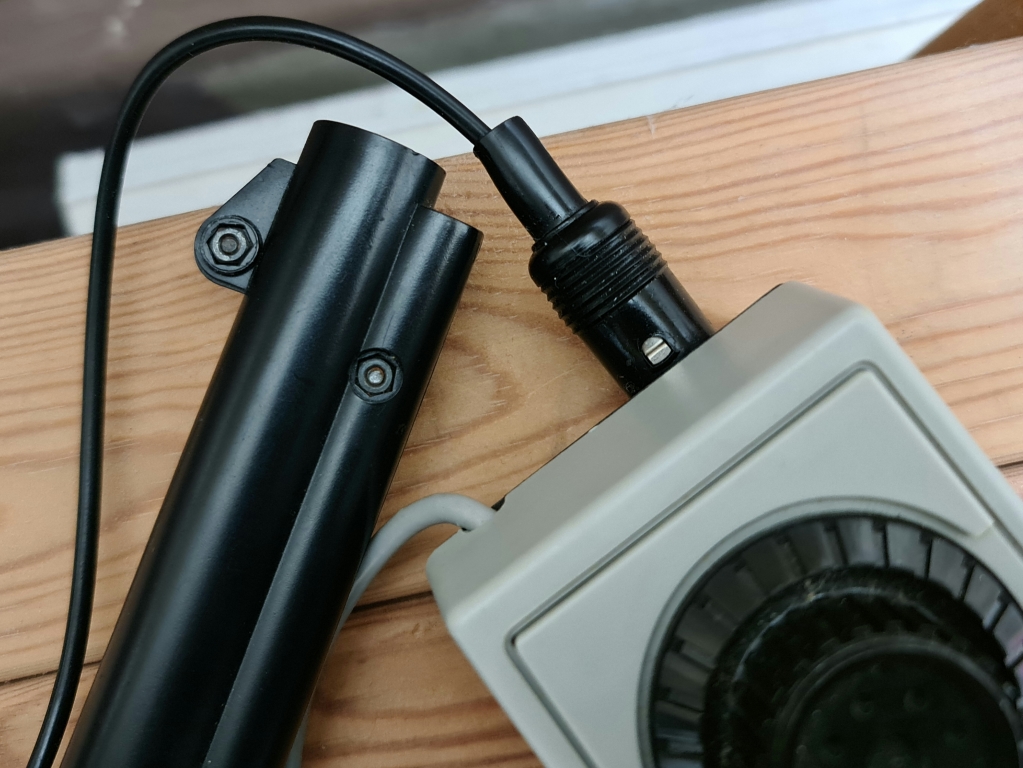 The pistol plugs into the top of the main handset via a five pin DIN plug