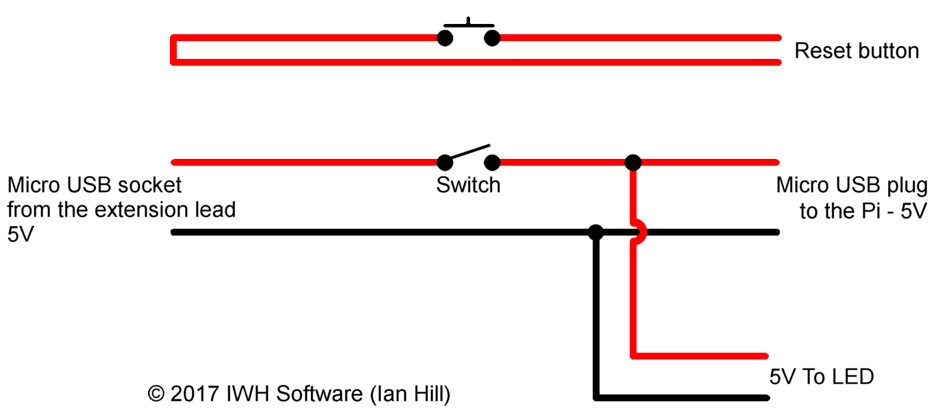 Power switch and reset button boardThe power switch is easy, it just goes inline with the power lead to the Pi, so cut that USB cable and solder it. Here's an image I crudely made that shows how to wire up the switch and button, you can see I connect the LED to the switched side of the switch so it's showing power is being supplied to the Pi, you could connect it to a GPIO pin on the Pi to have some control of it, although be aware that the Combian64 image has removed the RPI.GPIO libraries for speed reasons. However, you will need to reinstall them for the reset button anyway.