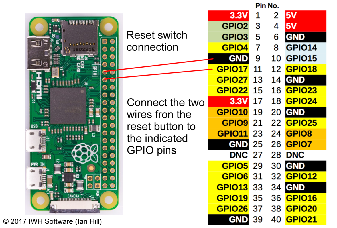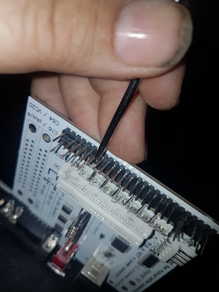 The switch from the Plus 4 has six pins coming out of it, the reset button has three, they are just toggle switches, you only need to use two pins on each component for them to work. You can use a mulitmeter on continuity mode to check which pins to use.One point to be aware of is some of the cheap micro USB sockets I used for the power connector on this, and various other projects, didn't use the red and black wires for power as you would expect, but rather blue, white, green or others. Here it was red and white, but white was positive and red was negative. It just seems to be random, so check with a multimeter to be sure.The wires from the reset button will go to the fifth and sixth pins down on the left hand row of header pins of the Pi when the Micro SD card is at the top. (GPIO17 and ground) It won't work yet, you have to install the GPIO libraries, a script to monitor the GPIO pins, and modify the startup sequence of Combian64, more on this later.