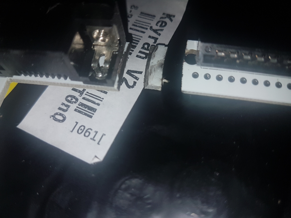 LED connectionThe LED does not work when the keyboard is connected to the KeyrahV2, so I desoldered the wires for the LED so they could go direct to the power board, if you want to reuse the original LED, you will need a 150 Ohm resistor installed in series with it, (if you put 5V on the original LED, it'll just burn out) but I replaced mine with a 5V green LED. If you want to replace the LED you will need to file down a standard round LED to fit, almost to the metal inside. Just keep filing at it until it fits. Remember that the flattened side is the negative pin, The original LED is a weird size and is not available, or i couldn't find it.