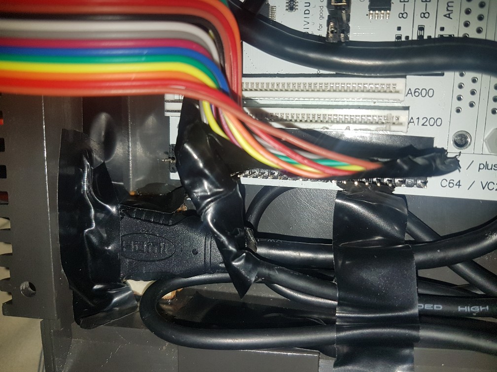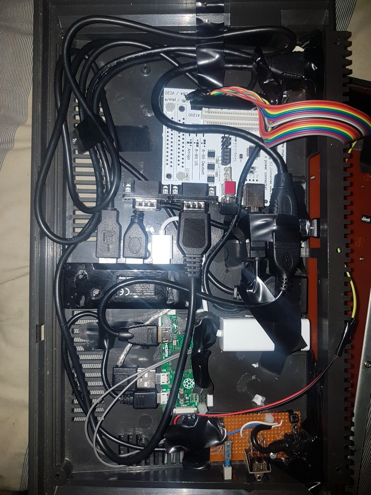 Yes, I did swear, a lot, much more than normal!!!All the components are mounted with no holes being drilled into the case. I used the original port holes for the sockets as best as I could, the HDMI video socket fits into the original hole for the video monitor socket, and the micro USB socket fits in the hole for the original Power socket, but due to the KeyrahV2 and Pi having to be at the back of the case blocking access to some of the ports, I had to use the large User Port hole for the USB ethernet adaptor and joystick extension, and finally I squeezed a USB socket in the Memory Expansion port by the KeyrahV2.