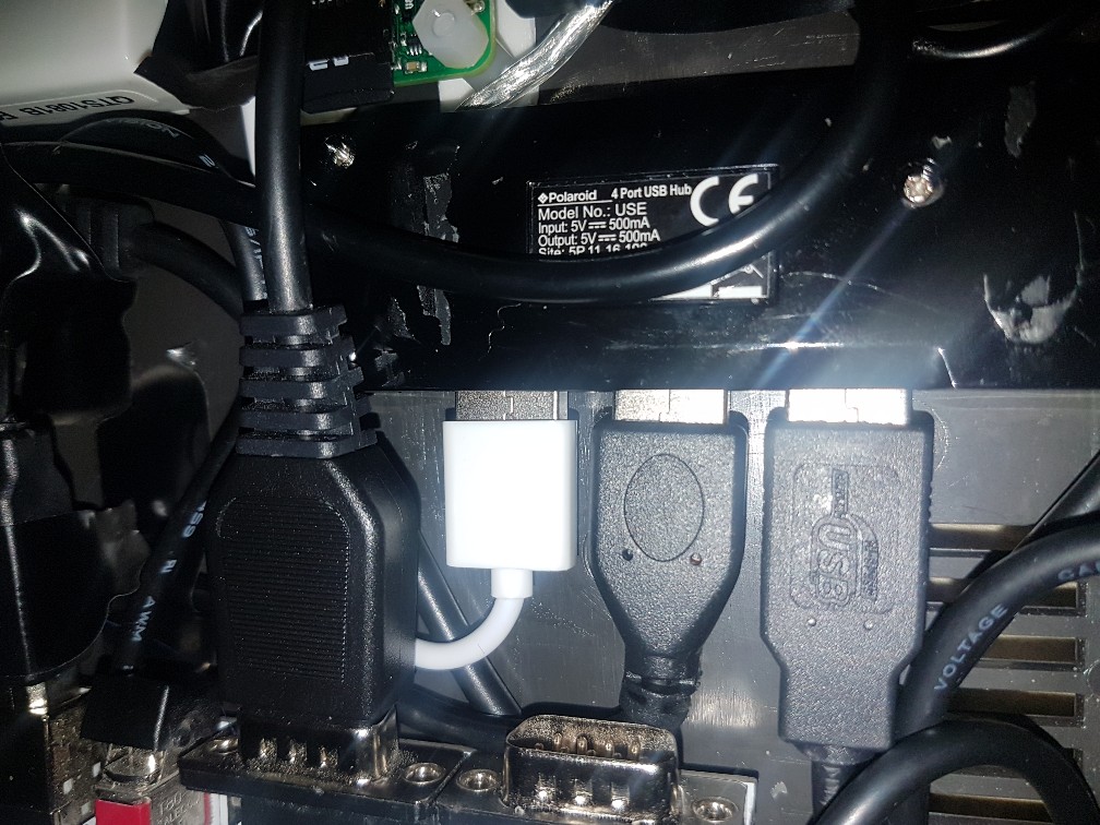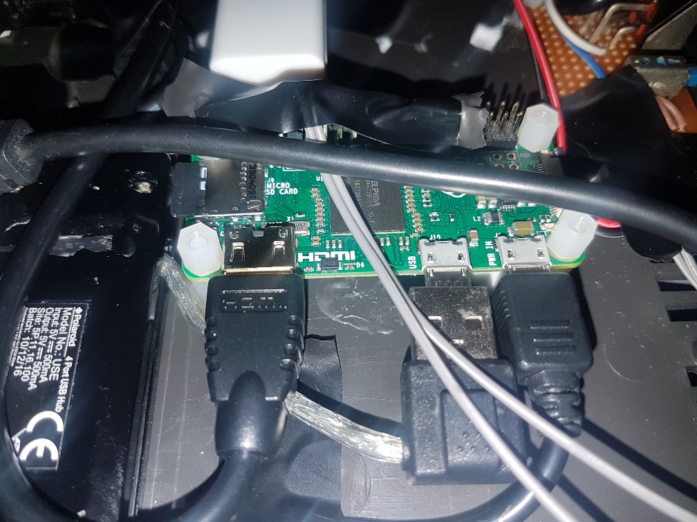 The boards are held in place with the original PCB mounting posts where possible, and short plastic standoffs where not. The USB hub, USB Ethernet adaptor etc are held down with double sided tape, the HDMI and Micro USB sockets are propped up with thin strips of wood covered in epoxy glue. And finally the cables and the pin header jumper wires are kept in place with normal insulation tape. All of this can be removed at a later date, if I decide to put it back to it's original condition.